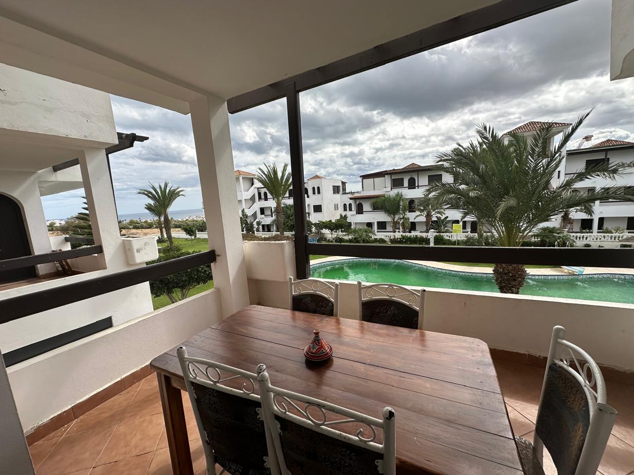 appartement 2 chambres, salon, 2 salles de bain, cuisine équipée et la terrasse vue piscine