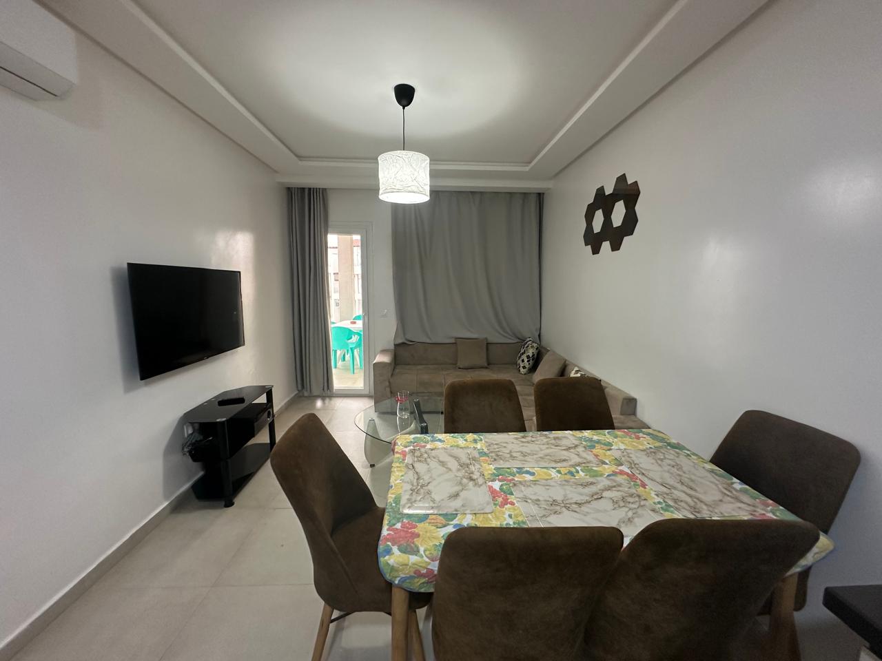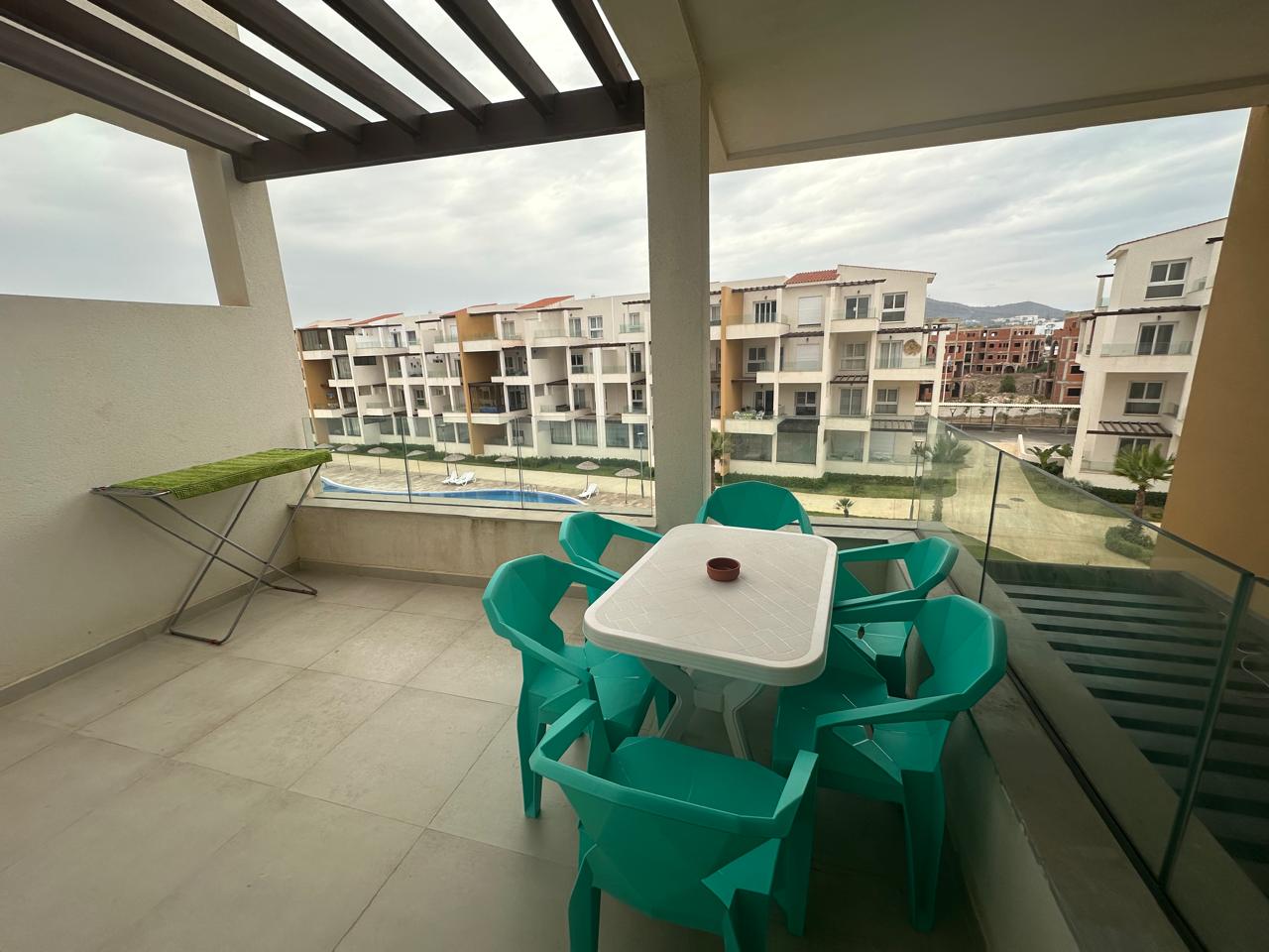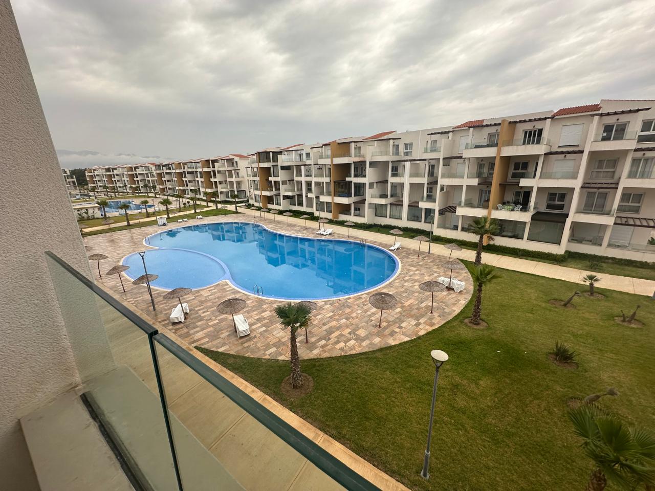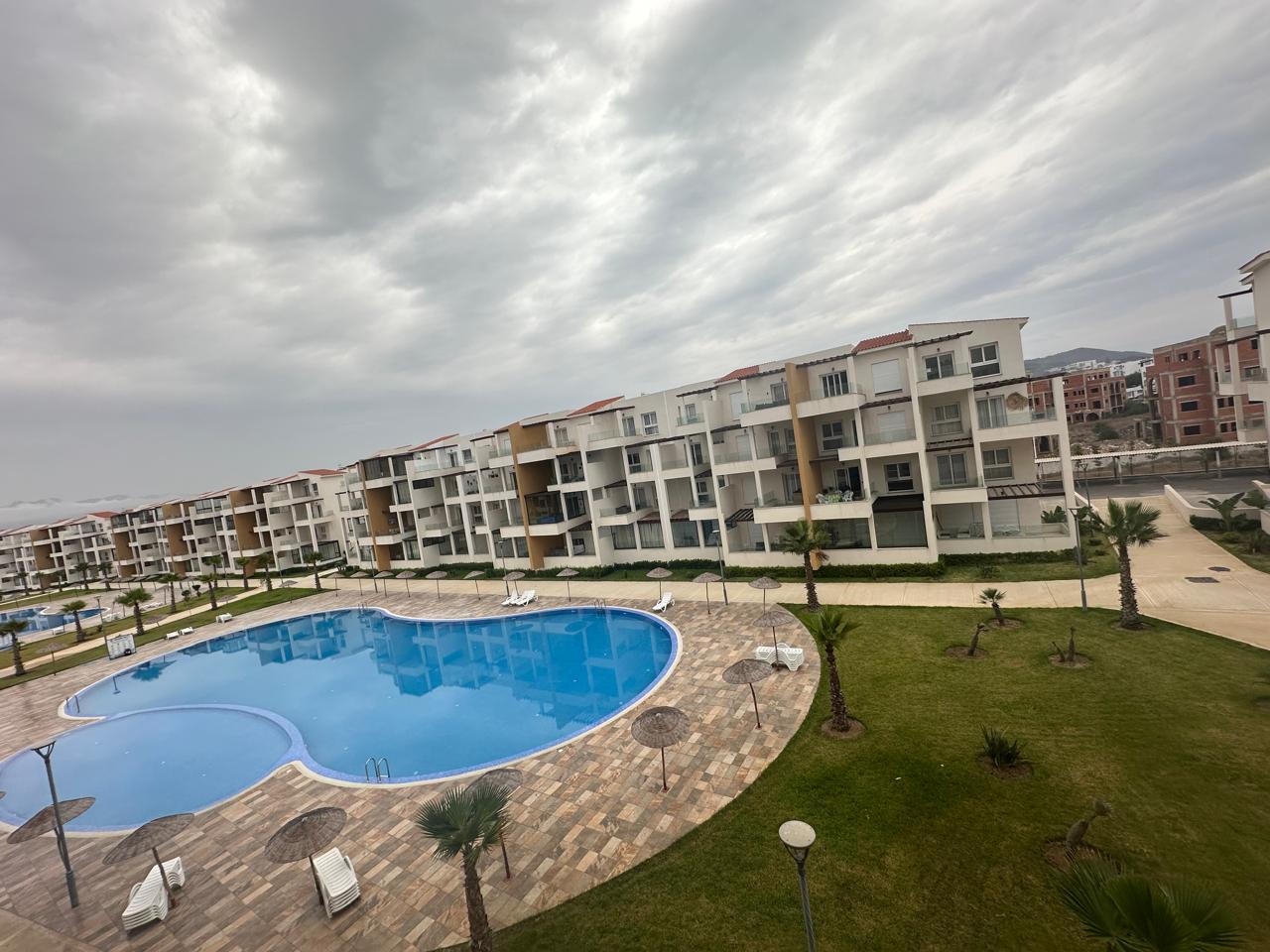 Appartement bien équipé pour la location par jour à cabo negro situé à 2 eme étage de deux chambres a coucher , un salon moderne , un sala manger , un salle de bain équipée et terrasse vue sur piscine l’appartement meublé et bien équipé climatisé .