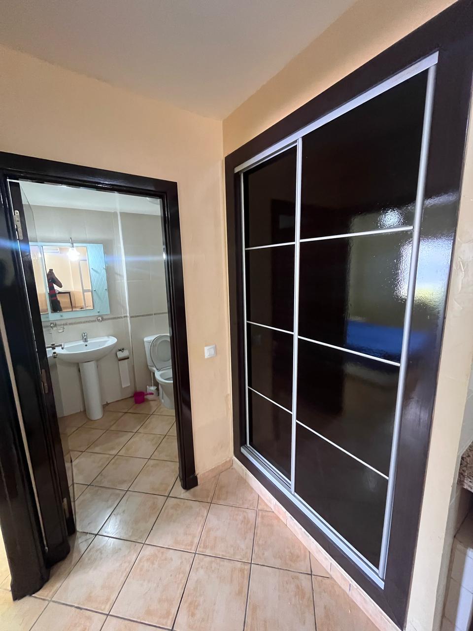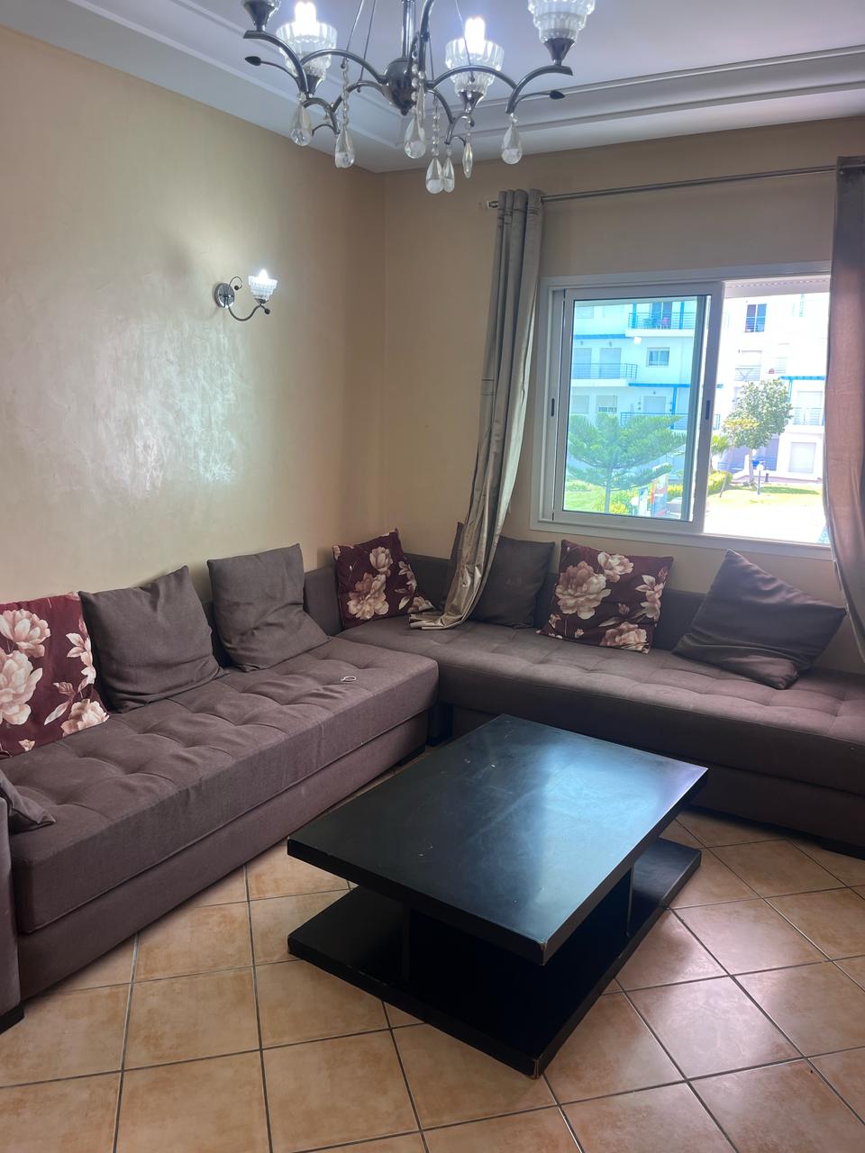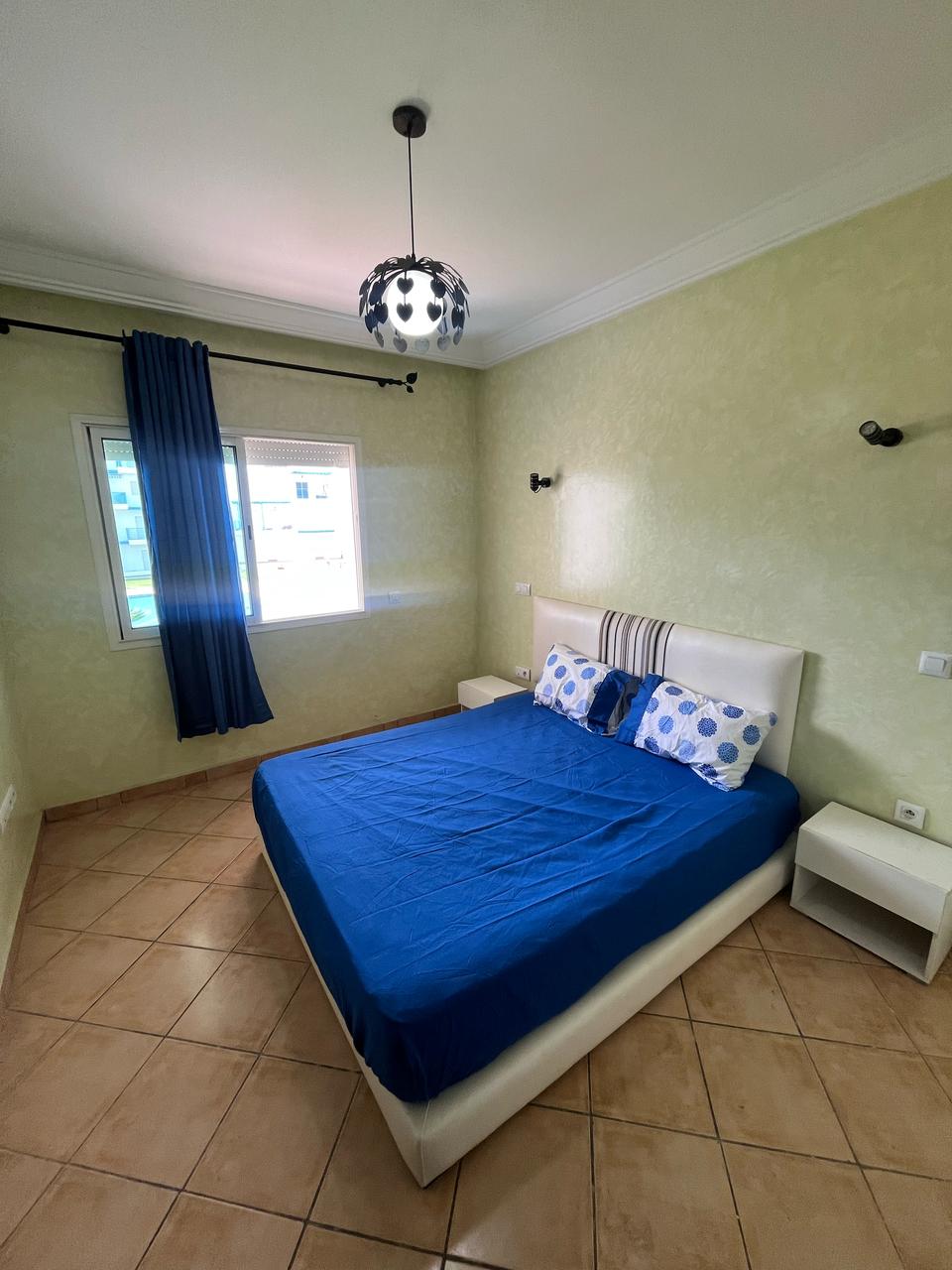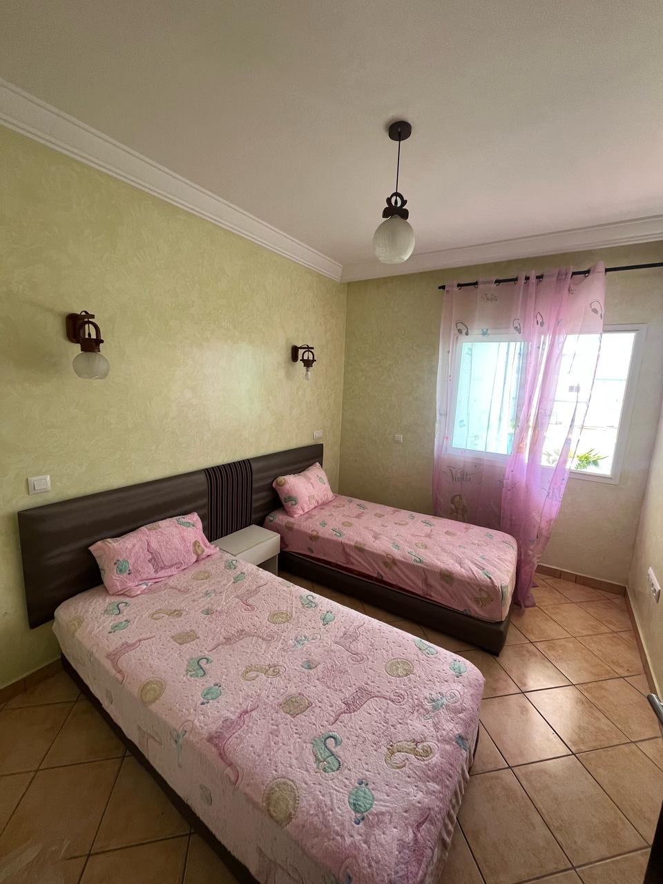 Belle appartement a vendre meublé et bien équipé situé à 1 ère étage elle se compose deux chambre a coucher , un chambre parentale avec un grant lit de deux place un placard , un chambre des enfants avec deux lits sépare , un salle de bain équipé , salon moderne de deux place, tv, cuisine American équipée avec tout les équipements nécessaire comme : machin a laver , four, réfrigérateur et plus des Ustensiles ménagers , un vue direct sur piscine résidence fermé avec trois grand piscines , espace de jeux , les terrais de sport , un café ,les parking sous-sol les ascenseurs ,wifi gratuit à la résidence disponible tout l’anné a proximité de tous les commodité , proche de la plage à 5 min a voiture.