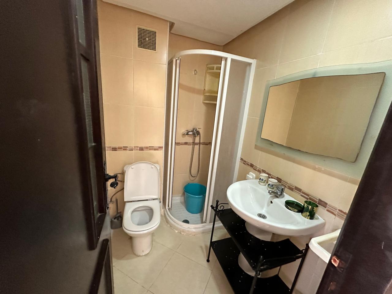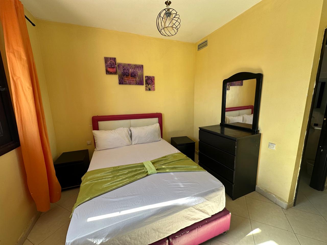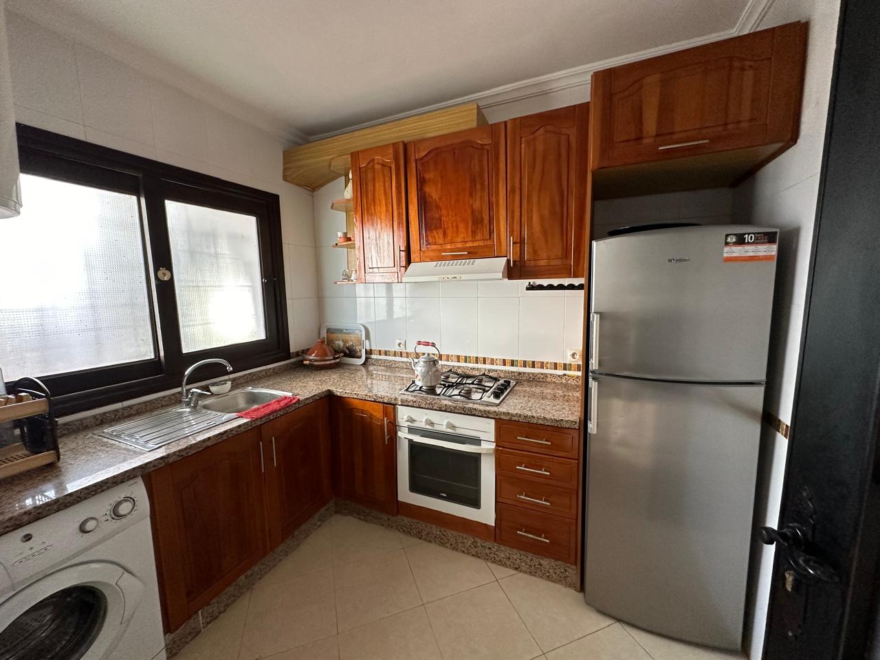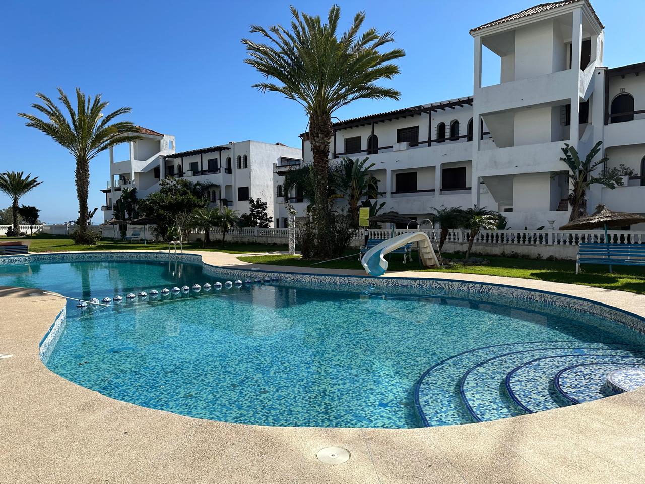 Appartement situé à 2 eme étage de deux chambres un chambre parentale avec un grand lit , un placard et avec accès direct à la terrasse , un chambre d’enfant de deux lits et un placard , de salle de bain cuisine marocain et un terrasse vue sur mer dans une résidence fermé avec deux grand piscine , les ascenseurs , équipe de sécurité 24/24 proche de la plage